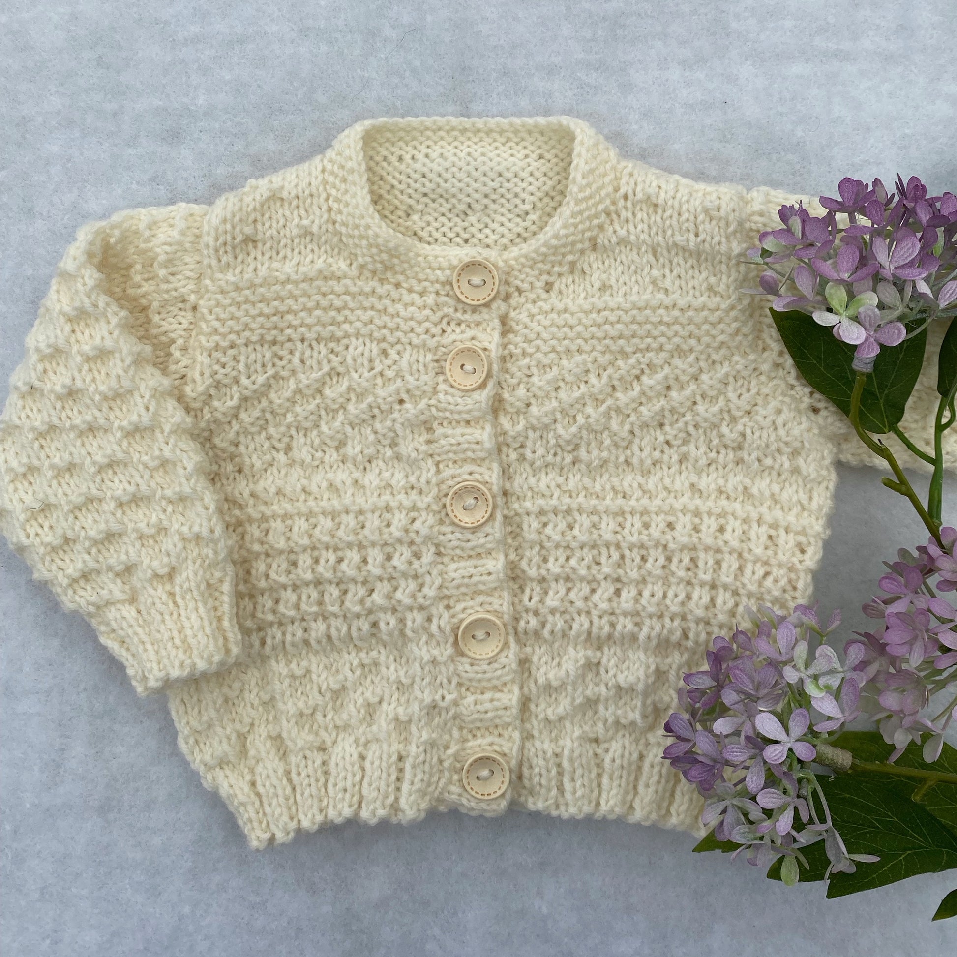 A lovely fully textured cardigan, hand knit in soft machine washable merino. Austen is fully buttoned to keep tummies warm and the sleeves gently taper to keep them in place. A truly classic cardigan design that works well for boys and girls.