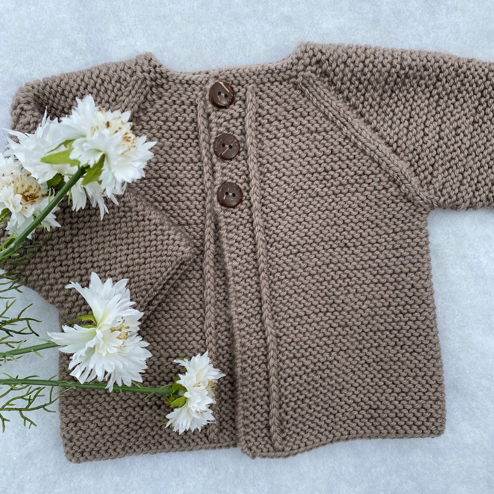 Little Angel is a lovely hand-knit merino baby cardigan. The timeless garter stitch texture adds a subtle charm and it's all finished off with three coconut-shell buttons for easy dressing and snug fit.