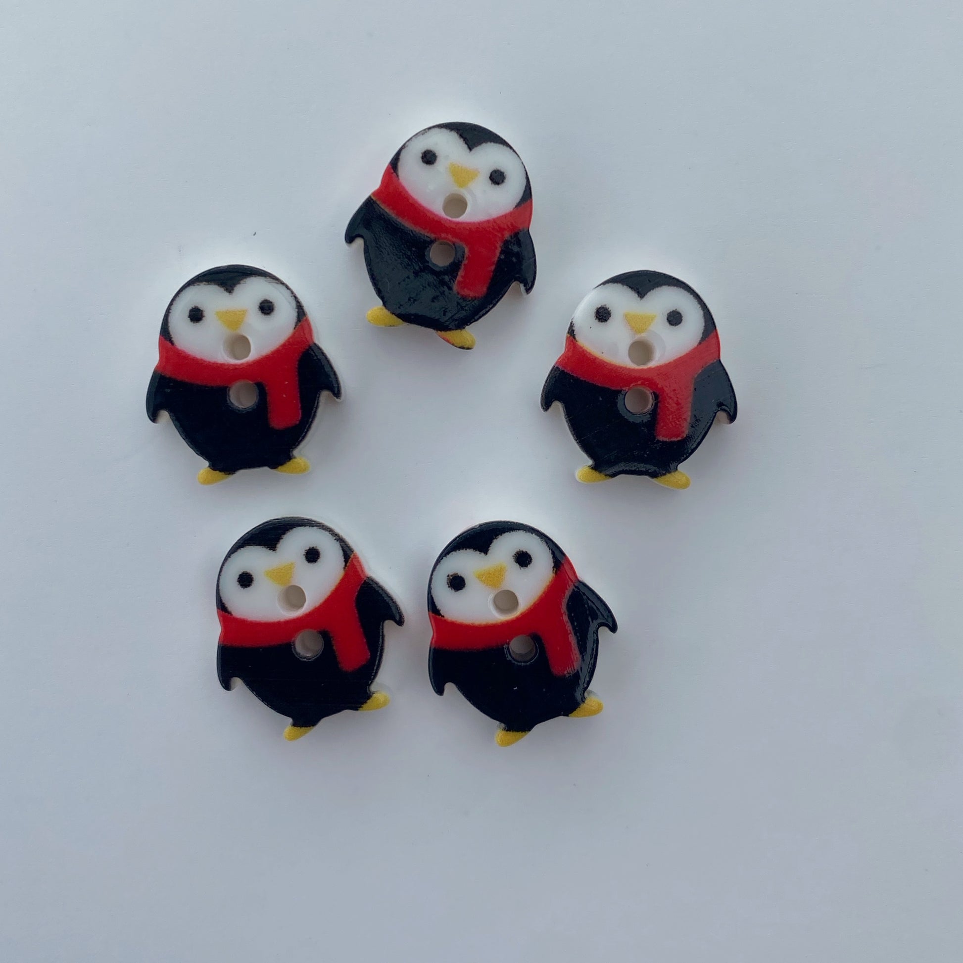 A pack of 5 novelty penguin buttons - resin. Each button has two holes and is approximately 15mm x 13mm